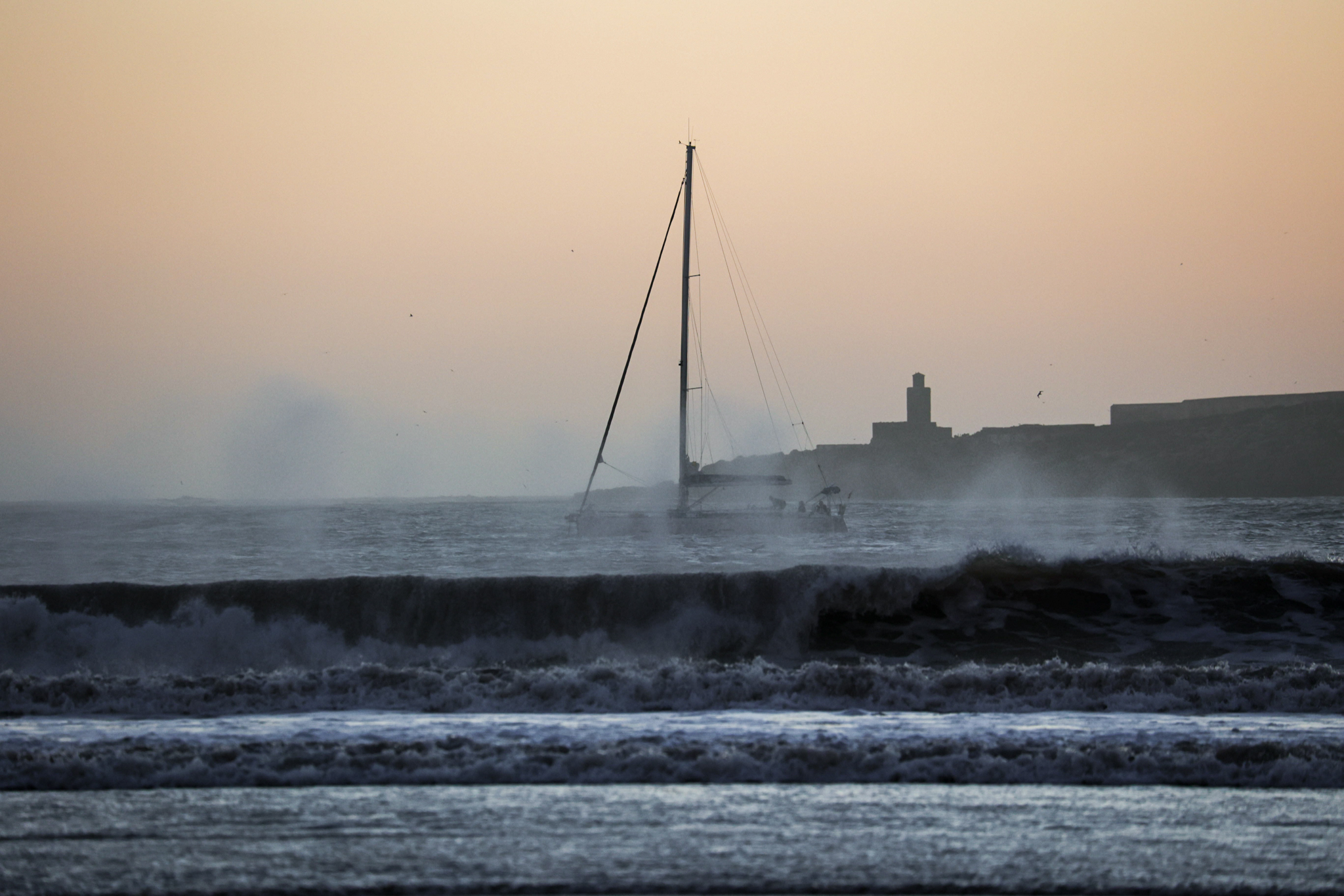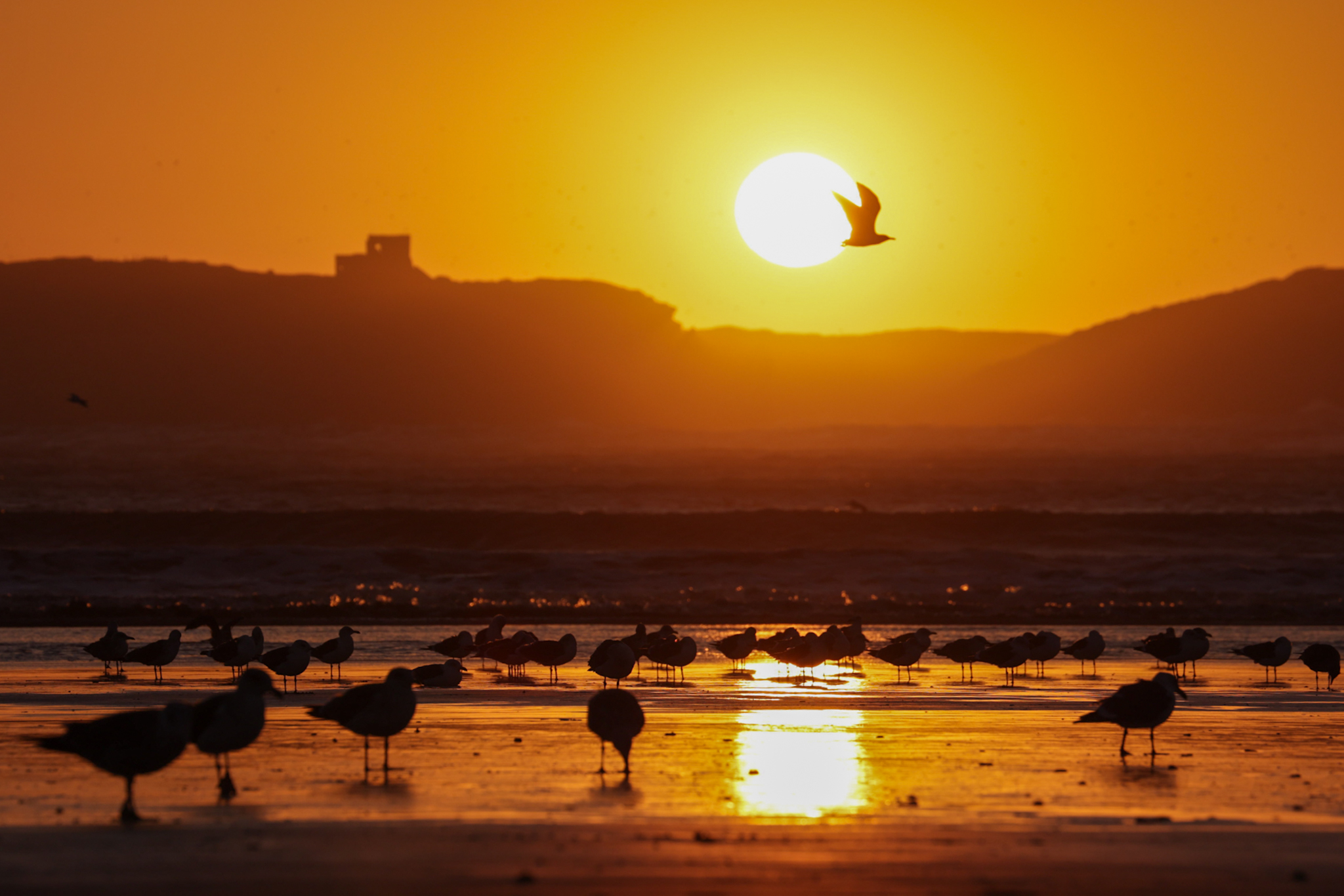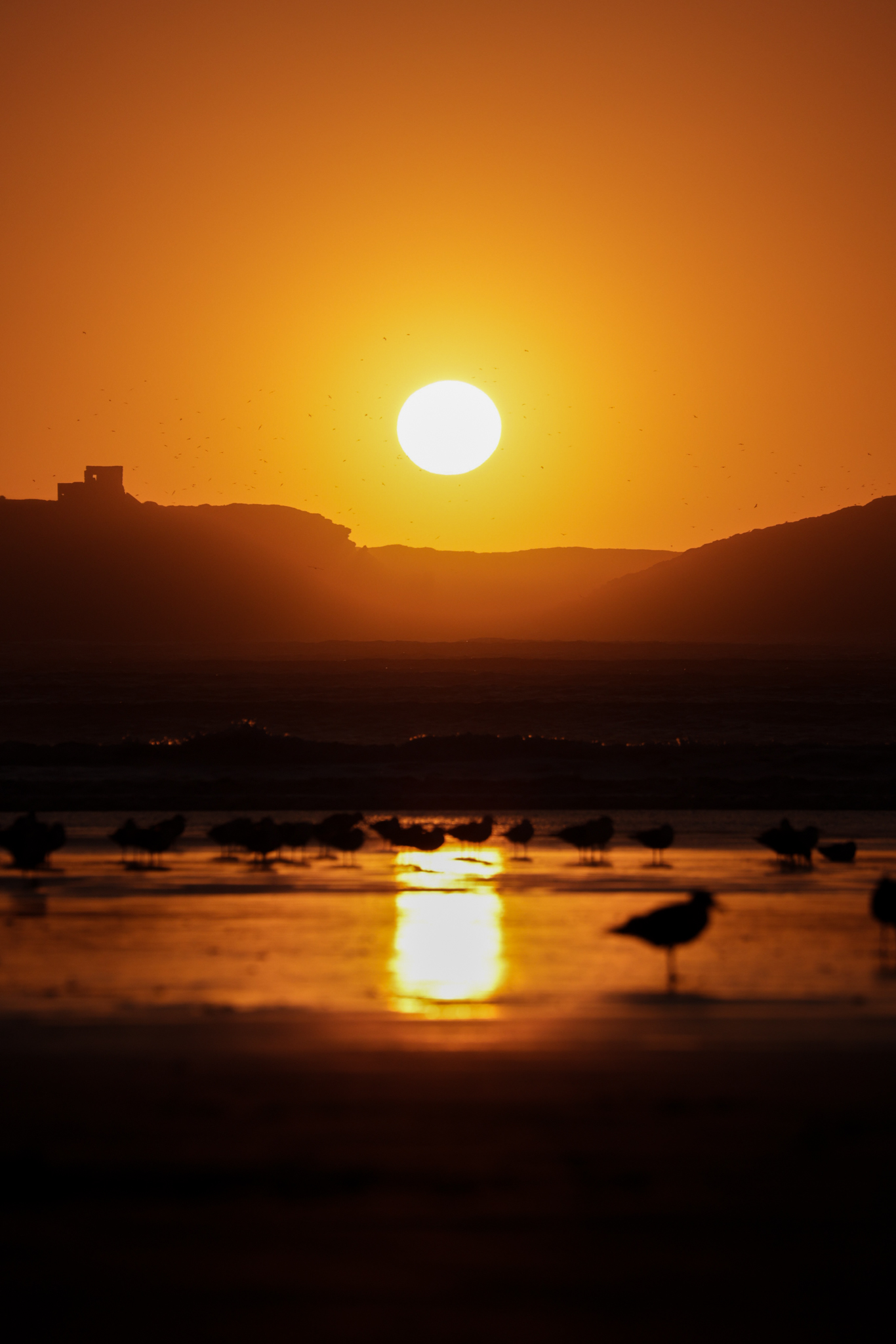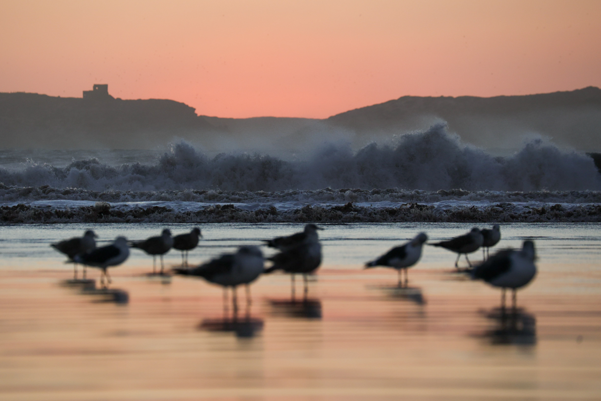 Wir kamen rechtzeitig in Essaouira an, um einen wunderschönen Sonnenuntergang mit Möwen und riesigen Wellen zu genießen.